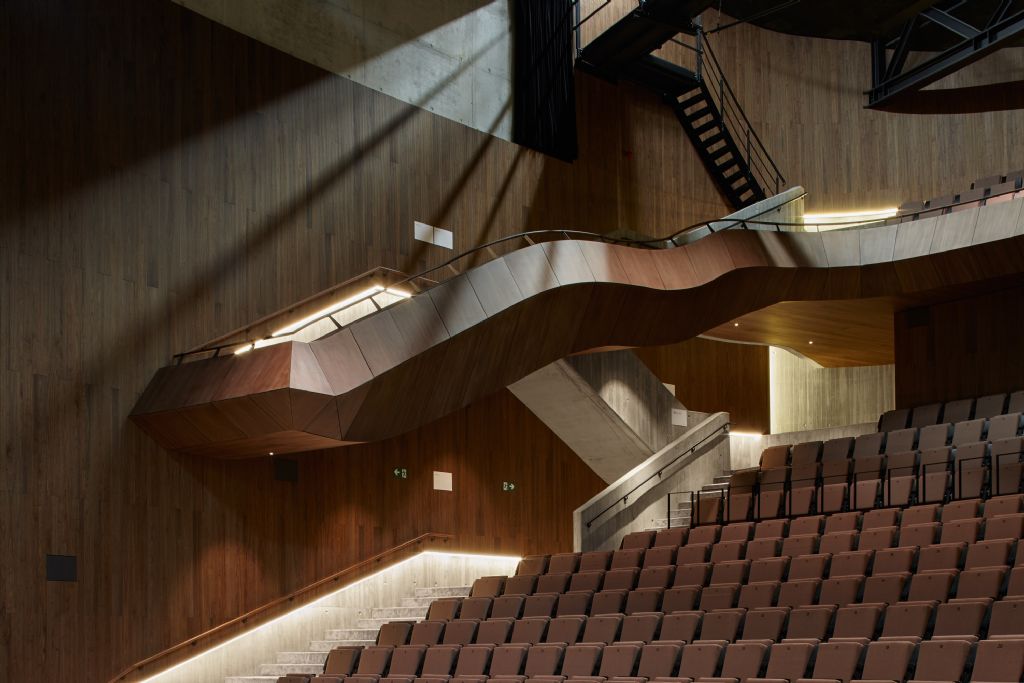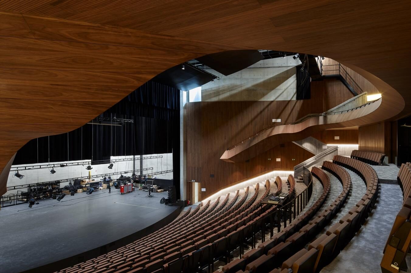 Large theatre hall with 679 seats and professional stage technology in sound and lights.