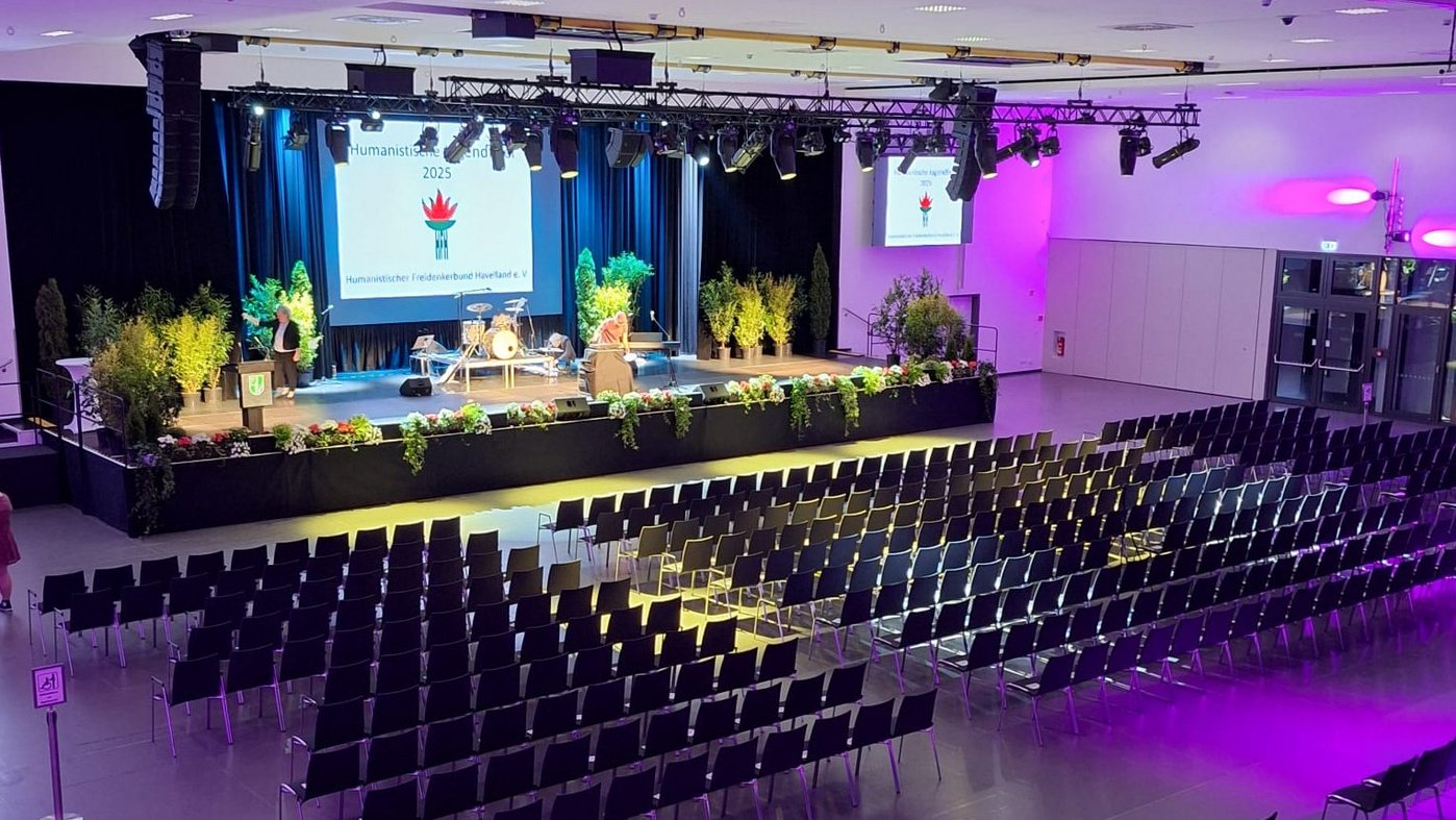 The event hall can host up to around 1,200 guests and offers a permanent stage with adaptable seating layouts.
